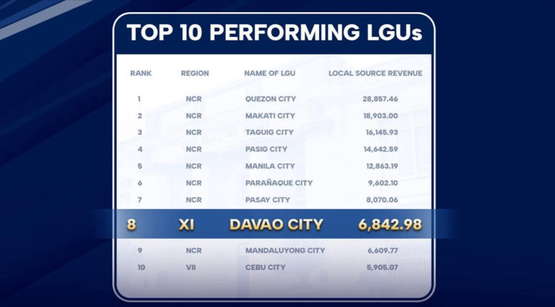 In the recently released DOF-BLGF Memorandum Circular No. 017.2025, which recognized top performing LGUs in strengthening Local Government Finance for the Fiscal Year (FY) 2024, Davao City maintained its spot among the Top 10 cities with a total of Php 6,842.98 million in LSR.