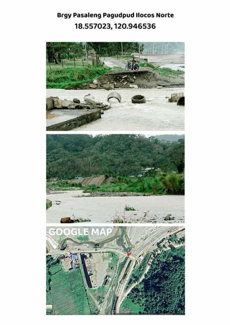 • Brgy. Poblacion 1, Pasuquin (18.339482, 120.614046) — an ongoing flood-control project appears partly buried under rubble, exposing questionable construction methods.