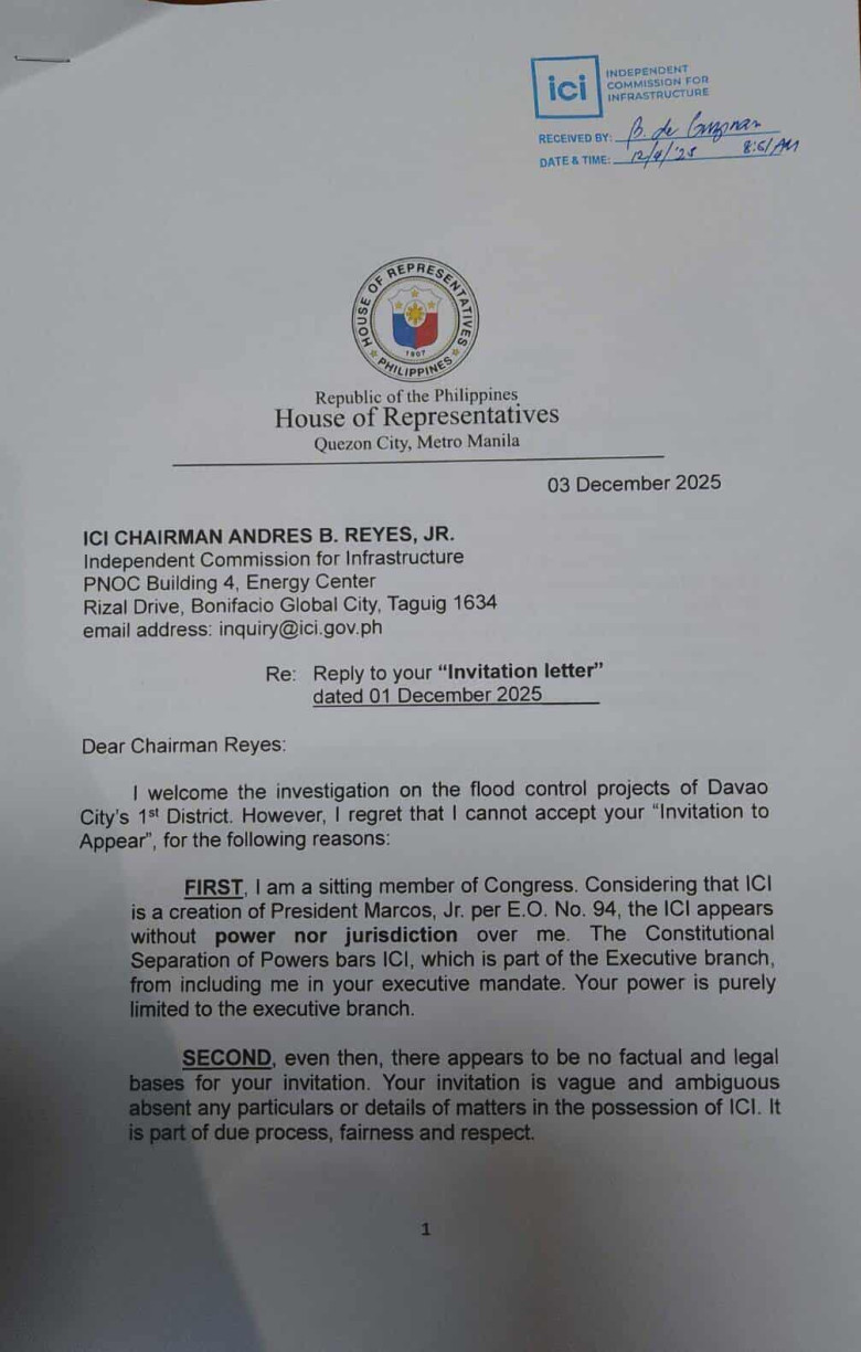 In a strongly worded letter addressed to ICI Chair Andres B. Reyes Jr., Duterte said the commission—created under Executive Order No. 94—is part of the Executive branch and therefore cannot summon or compel a sitting member of the House, citing the constitutional doctrine of separation of powers.