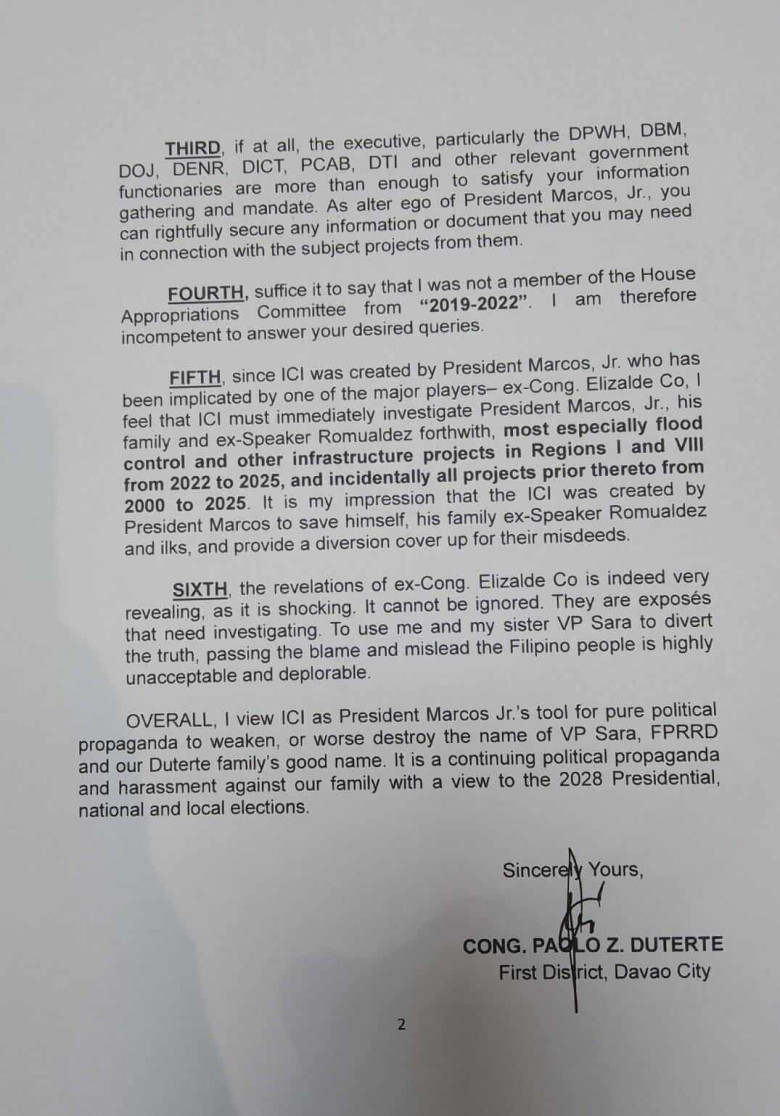 In the second page of his letter, Duterte escalated his criticism, asserting that the ICI should instead investigate President Marcos Jr., his family, and former Speaker Martin Romualdez, citing revelations made by former congressman Elizalde Co implicating them in flood-control and infrastructure projects in Regions I and VIII from 2022 to 2025.