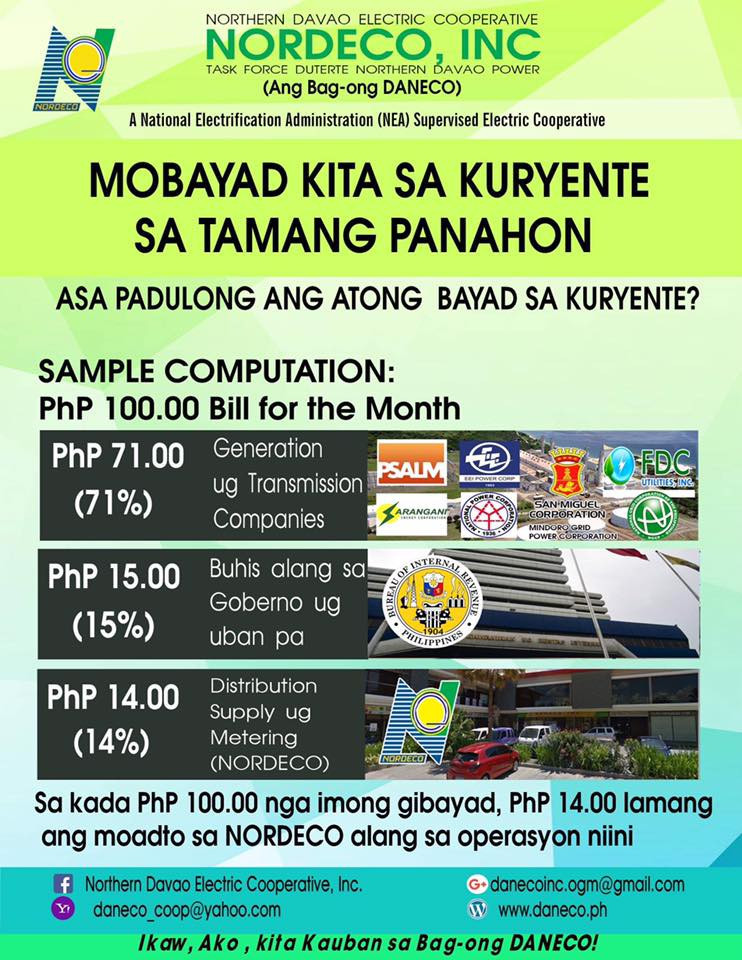 Nordeco in its Facebook announcement clarified that of the total bill, 71percent or P71 pesos goes to generation charge; 15 percent or P15for government tax and other charges; and 14 percent or P14 for Nordeco(distribution and metering charges).