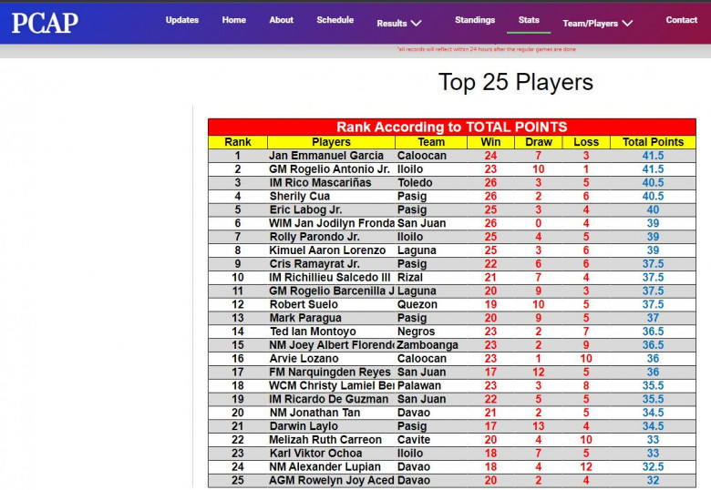 NM Alexader Lupian ranked 24th with 18 wins, four draws, and 12 defeats for 32.6 points.