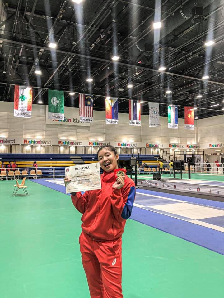 The Pinay, a fencing varsity of Penn State in the US, won her two other gold medals as a member of the Canlas Fencing team with Victoria Ebdane, Julliana Jimenez, and Jodie Danielle Tan.