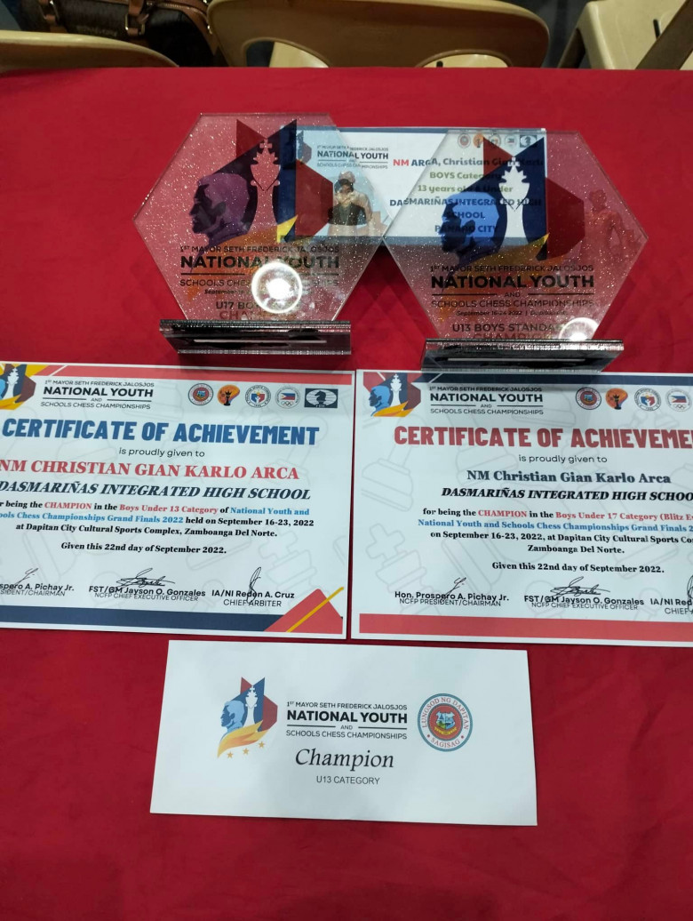 Arca, a Grade 8 student at Dasmarinas Integrated High School in Dasmarinas City, Cavite, who is 13 years old, won the blitz event on Thursday in the Under-17 Open division with a final score of 7.5 points while playing under the direction of Rep. Elpidio "Pidi" Barzaga Jr., National Coach Fide Master Roel Abelgas, and Class Advisor Melinda Calumaya.