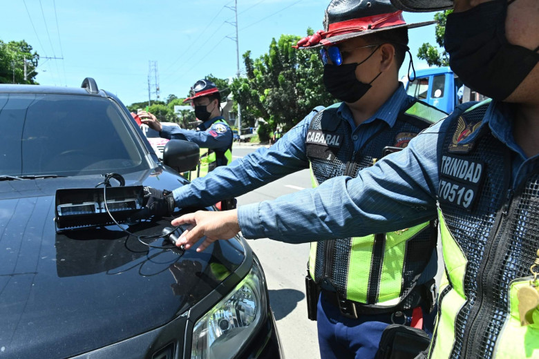 Members of the Regional Highway Patrol Unit XI shows to the media a confiscated blinker attached to a private vehicle along Quimpo Blvd., Davao City, Thursday morning (July 7).