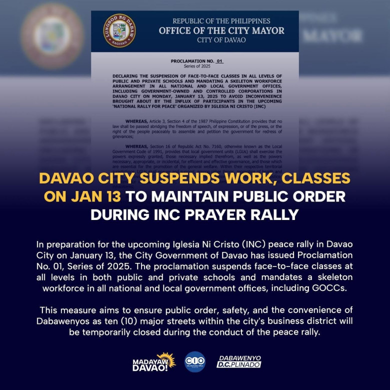 Public Safety and Security Office (PSSO) head Angel Sumagaysay said that the suspension of work and classes on January 13 will help manage traffic and ensure the convenience of Dabawenyos especially those working or studying within the event areas.