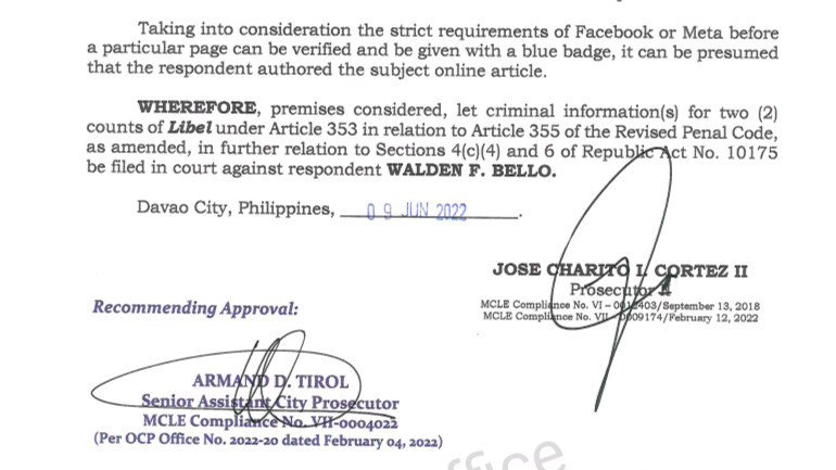 In a seven-page resolution dated June 9,2022, Prosecutor Jose Charito Cortez II found probable cause to file the information to court since the Facebook Post of Bello has malicious imputation against Tupas.