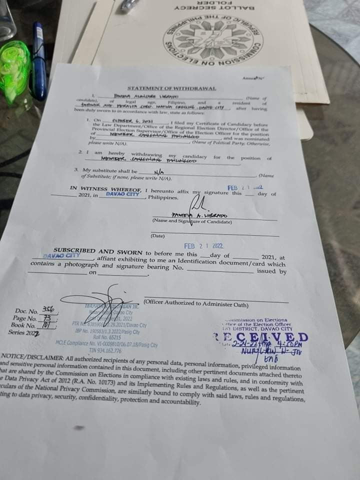 Alas kuwatro karong hapon, personal nga giduso ni Librado ang iyang certificate of withdrawal sa Comelec human matod pa kini mitambong sa usa ka event sa mga kababainhan.
