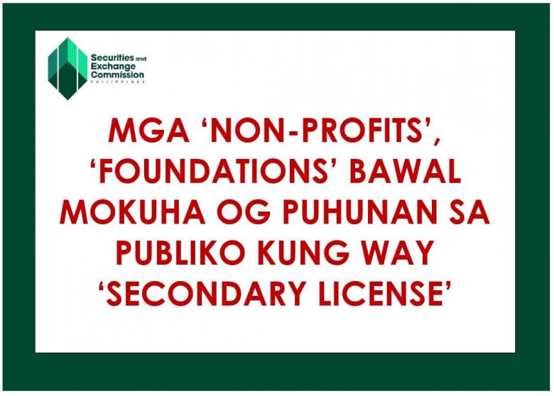 “Ang mga ‘non-stock, non-profit’ nga mga korporasyon, lakip niini ang mga ‘foundation,’ wa gihatagan og katungod nga mangolekta og pamuhunan sa publiko. Sa makausa pa, bisan unsang porma sa ‘investment solicitation’ nga way ‘secondary license’ gikan sa Commission ginadili sa balaud,” dugtong pa sa opisina.