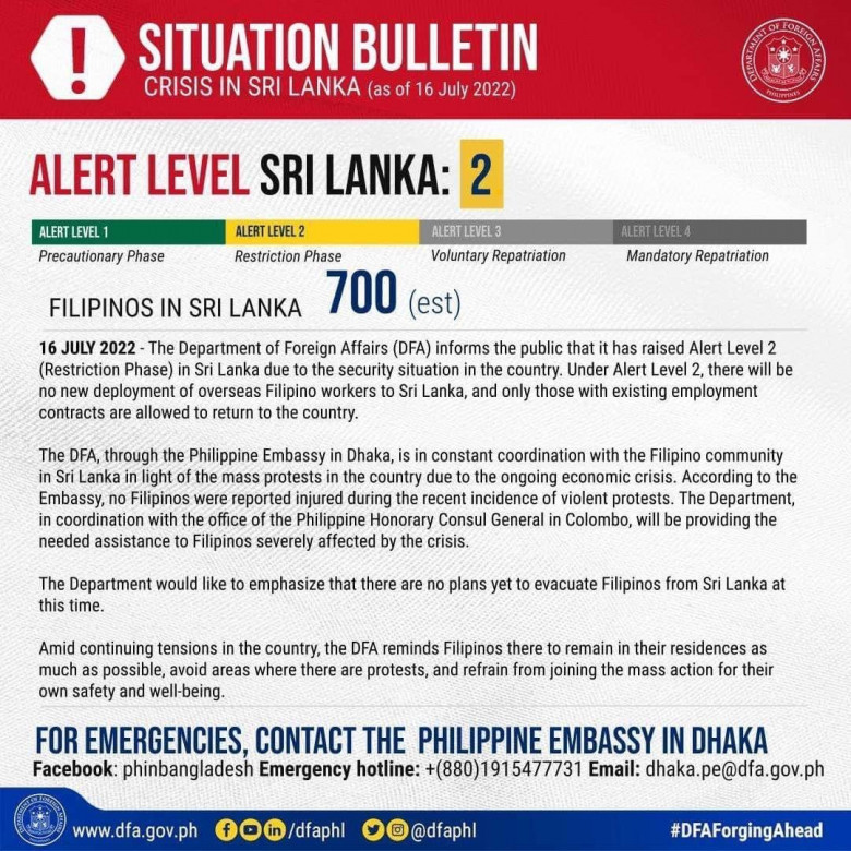 Wala namang planong magpatupad ang DFA ng evacuation ng mga Pilipino sa Sri Lanka.