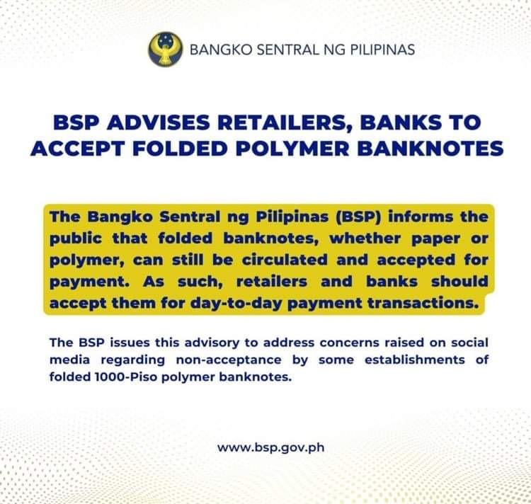Gihimo sa BSP ang advisory aron tubagon ang mga kabalaka ug concerns sa social media labot sa sumala pa dili pagdawat sa mga establisiyemento sa mga nakalukot nga 1,000 pesos polymer banknotes.