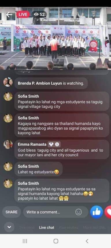 Sa screenshot sa Taguig City Facebook Live, makita ang mensahe gikan sa nagngalang Sofia Smith nga niingong iyang pabuthan ug bomba ug patyon ang tanang estudyante sa Signal Village National High School.
