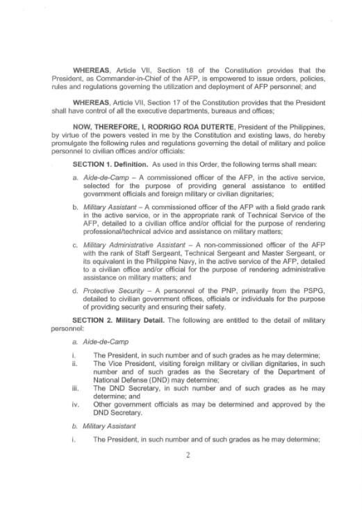 Section 2 of said order, states that only the President, Vice President, the Department of National Defense (DND), and other government officials as approved by DND Secretary are entitled for military security details.