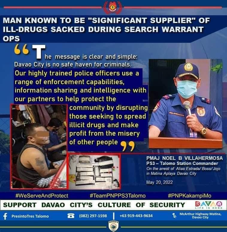 Major Noel B Villahermosa, Talomo Chief of Police, identified the suspect through his aliases as Estrada, Boss, and Jojo, a resident of said barangay.
