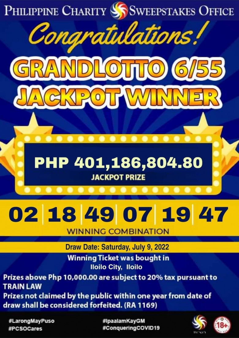 Sa gipagawas nga impormasyon sa Philippine Charity Sweepstakes Office (PCSO) muabot sa P401 million ang total jackpot price sa wala gihinganlang nipatad nga taga-Iloilo City.
