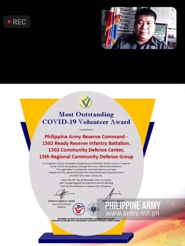 Gihimo sa opisyal ang pahayag human gidawat sa Army Reserve Command 1502nd Community Defense Center (CDC) sa Agusan del Sur ang Caraga Region Most Outstanding COVID-19 Volunteer Organization Award.