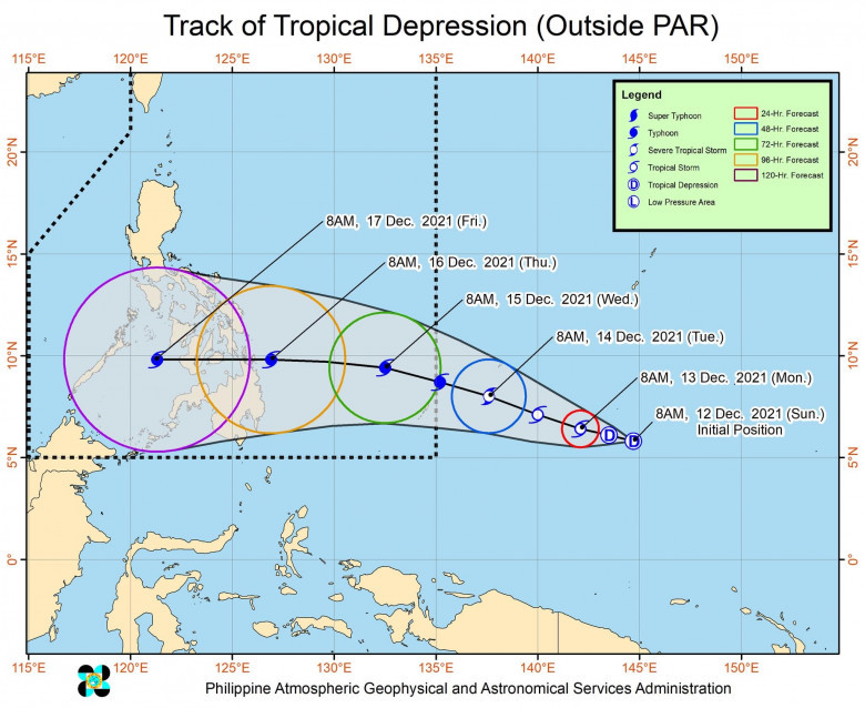 The center of the Tropical Depression was estimated based on all available data at 2,095 km East of Mindanao (5.7°N, 144.1°E) (outside the PAR)