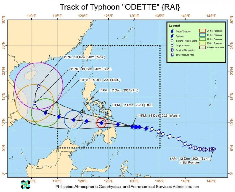 • On the forecast track, Typhoon “ODETTE” will continue moving generally westward over the Philippine Sea and the center of its eye is forecast to make landfall in the vicinity of Dinagat Islands, Siargao-Bucas Grande Islands, or the northern portion of Surigao del Sur this afternoon. Afterwards, the center of “ODETTE” will move westward and cross several provinces in Central and Western Visayas regions before emerging over the Sulu Sea tomorrow morning. After passing near or in the vicinity of either Cuyo or Cagayancillo archipelago, “ODETTE” is forecast to cross the northern or central portion of Palawan tomorrow afternoon or evening before emerging over the West Philippine Sea.
