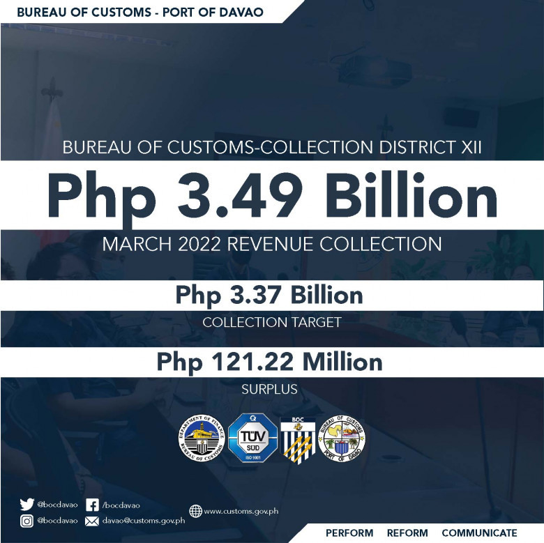 BOC Davao District Collector lawyer Erastus Sandino B. Austria in a statement said the amount is 3.60 percent higher against its assigned target of P3.37 billion posting a P121.22 million surplus.