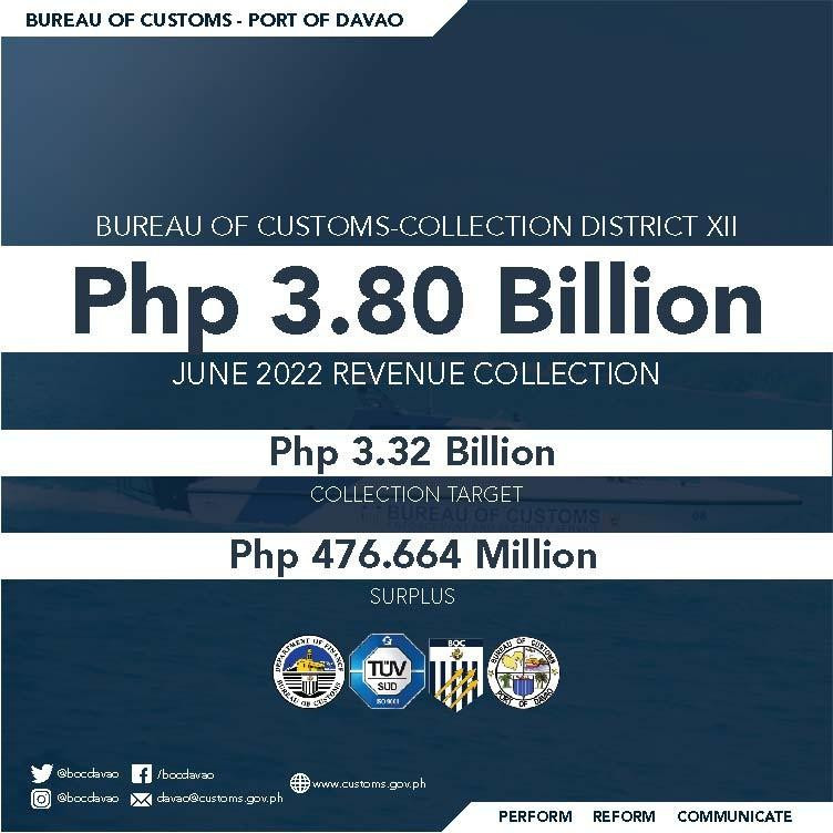 BOC- Davao collected P3.80 billion, or 14.35 percent higher from its assigned target of P3.32 billion, posting a surplus of 476.66 million pesos.