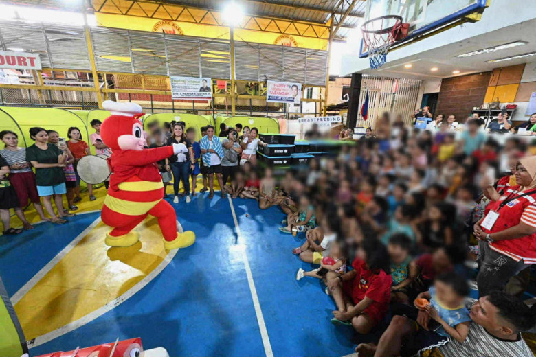 The activity, held at a covered court in the affected barangay, featured games, food packs, toys, and a lively visit from popular mascot Jollibee, drawing cheers and laughter from the children and their families.