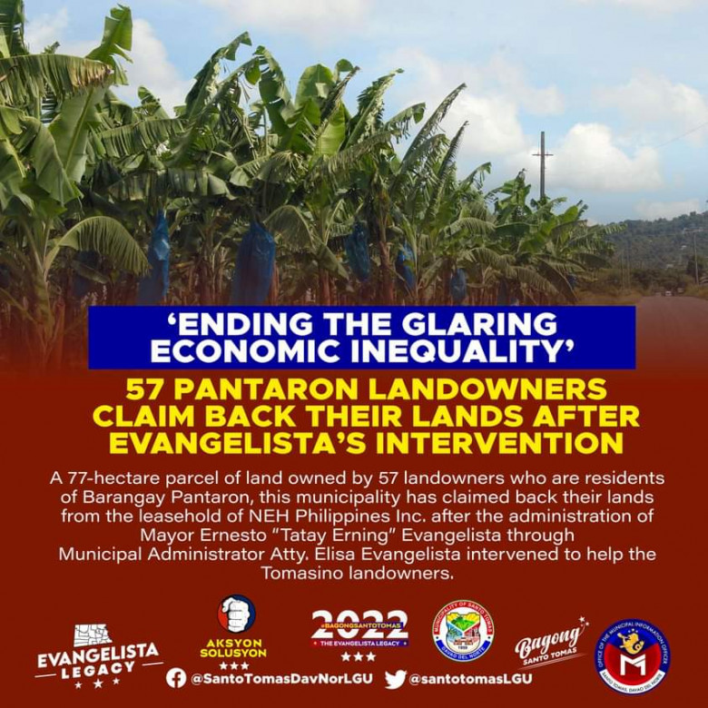 She said the Evangelista administration is serious to end the “glaring economic inequality” prevailing in various banana plantations where Tomasino landowners and plantation workers have suffered from cheap wages, poor working conditions, non-payment of social benefits, and above all, non-compliant to labor laws.