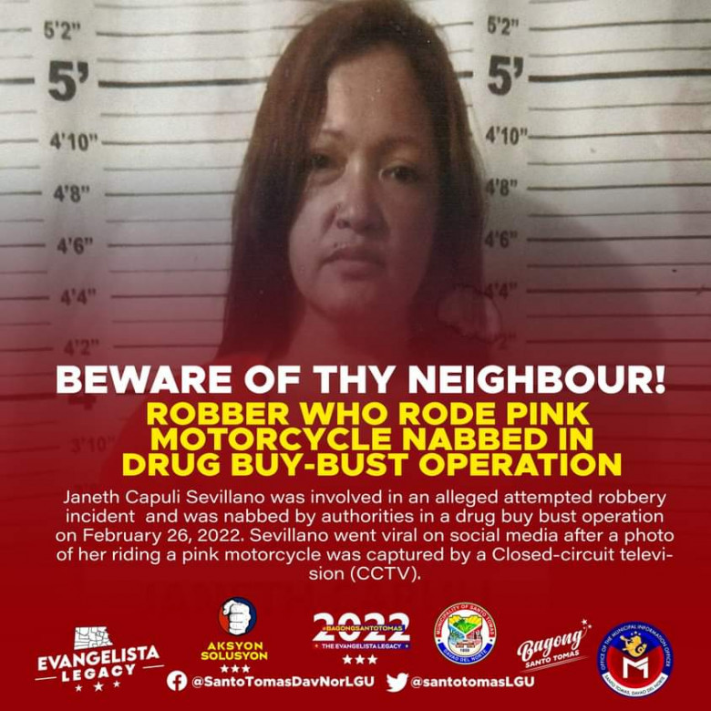 In a statement, Santo Tomas Municipal Police Station commander Major Rodante Varona identified the suspect as Janeth Capuli Sevillano who is a transient resident of Purok 7, Feeder Road 2, Barangay Tibal-og, Santo Tomas, Davao del Norte.