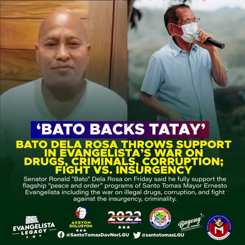“Salamat sa words of support gikan kay Senator Dela Rosa. Dako kining encouragement sa atong mga kapulisan, BPLKs, kasundaluhan, ug uban pang sectoral groups na nahimo natong partners para mas epektibo ang atong pag-implementar sa mga program batok corruption, insurgency, criminality ug uban pa. Tungod sa liderato sa atong mahal na President Duterte atong gisugdan ang anti-illegal drug war dinhi sa Santo Tomas aron atong matabangan ang katawhan malayo sa druga,” Evangelista said.