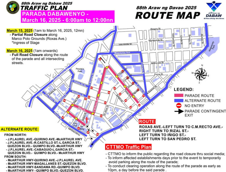 For Parada Dabawenyo on Sunday, March 16, temporary road closures will be implemented at 4 am in the following locations: Roxas Ave. (from the corner of Quezon Blvd. to Ponciano Rotonda); C.M. Recto Ave. (from the corner of Magsaysay Ave. to the corner of Pichon St.); Rizal St. (from the corner of C.M. Recto Ave. to the corner of Iñigo St.); Iñigo St. (from the corner of Rizal St. to the corner of San Pedro St.); San Pedro St. (from the corner of C.M. Recto Ave. to the corner of Iñigo St.), and City Hall Compound - Old Engineers Alley until the parade ends.