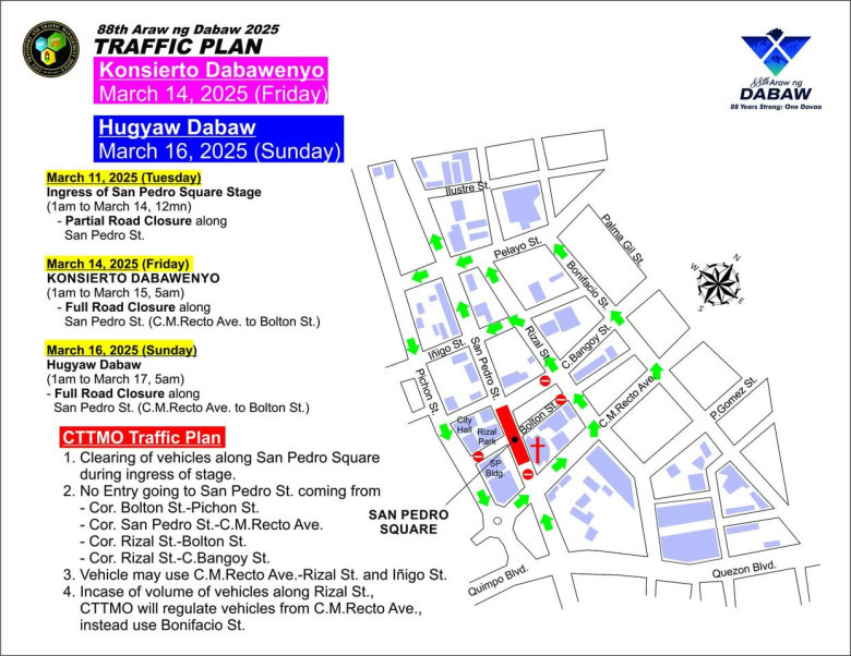 The CTTMO said that based on Resolution No. 04170-25, Series of 2025, and City Ordinance No. 0777-25, Series of 2025, temporary road closures will be implemented for Konsierto Dabawenyo on March 14, as well as Parada Dabawenyo and Hugyaw Dabaw on March 16.