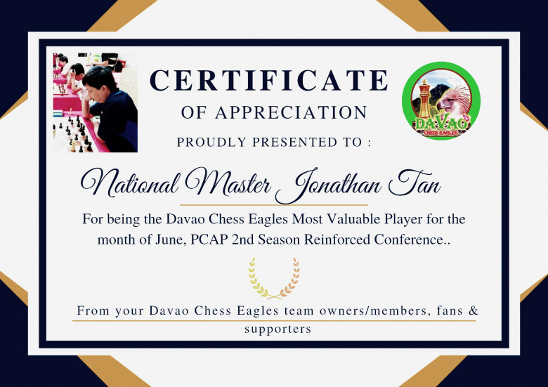 Former national chess youth champion National Master (NM) Jonathan Tan is the most valuable player for the Davao Eagles chess team for June in the ongoing 2022 Professional Chess Association of the Philippines chess tournament season two.