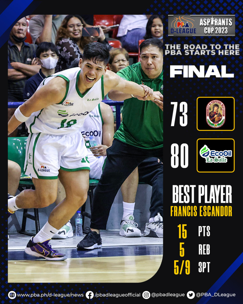 Lefty shooter Francis Escandor scored 15 points in his team's 80-73 win over the Perpetual Help University Altas in the PBA D-League Aspirants Cup 2023 on May 16.