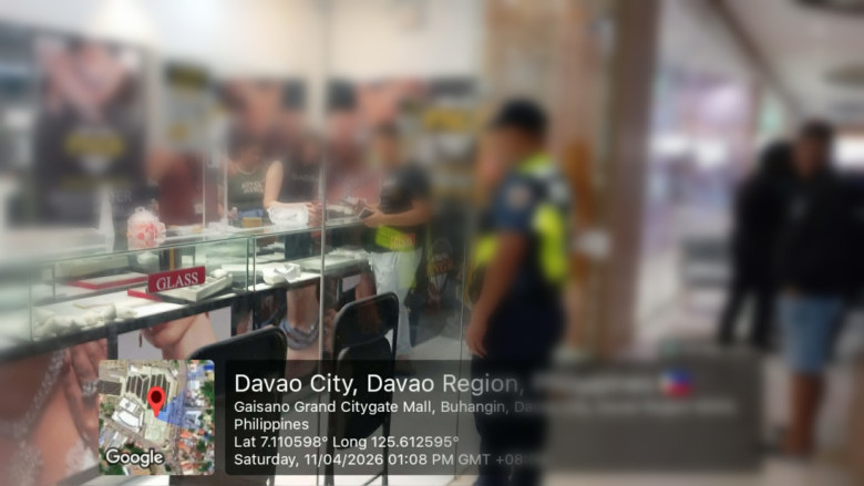 Gisulod sa upat ka lalaki, usa niini armado ang Precious Asher Trading Corp. Jewelry Store nahimutang sud sa Gaisano Grand City Gate Mall, corner Tigatto ug Cabantian Road, Brgy. Buhangin, Davao City alas 12 Sabado sa udto, Abril 11, 2026.