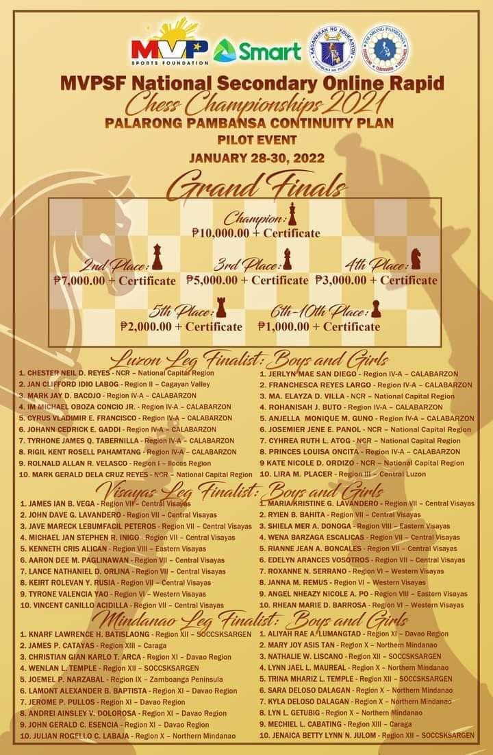 In the boys division, Panabo City chessers National Master Christian Gian Karlo Arca and Jerome Pullos are set to compete against other chessers from other regions of the Philippines.