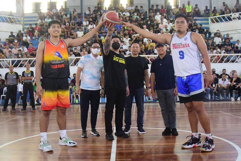 CEREMONIAL TIP-OFF. Davao City Mayor Sebastian Duterte presides the ceremonial toss of the The Royal Mandaya Hotel Xmas Basketball Games which opened Monday, December 19 at the Davao City Recreation Center. Atty. Mans Carpio and businessman Glenn Escandor grace the opening ceremony. (Koii Canarias/Hoops)