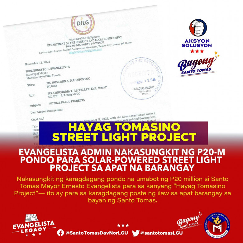 Ang nasabing pondo ay gagamitin para sa karagdagang poste ng ilaw sa limang barangay sa bayan ng Santo Tomas sa Davao del Norte.ย