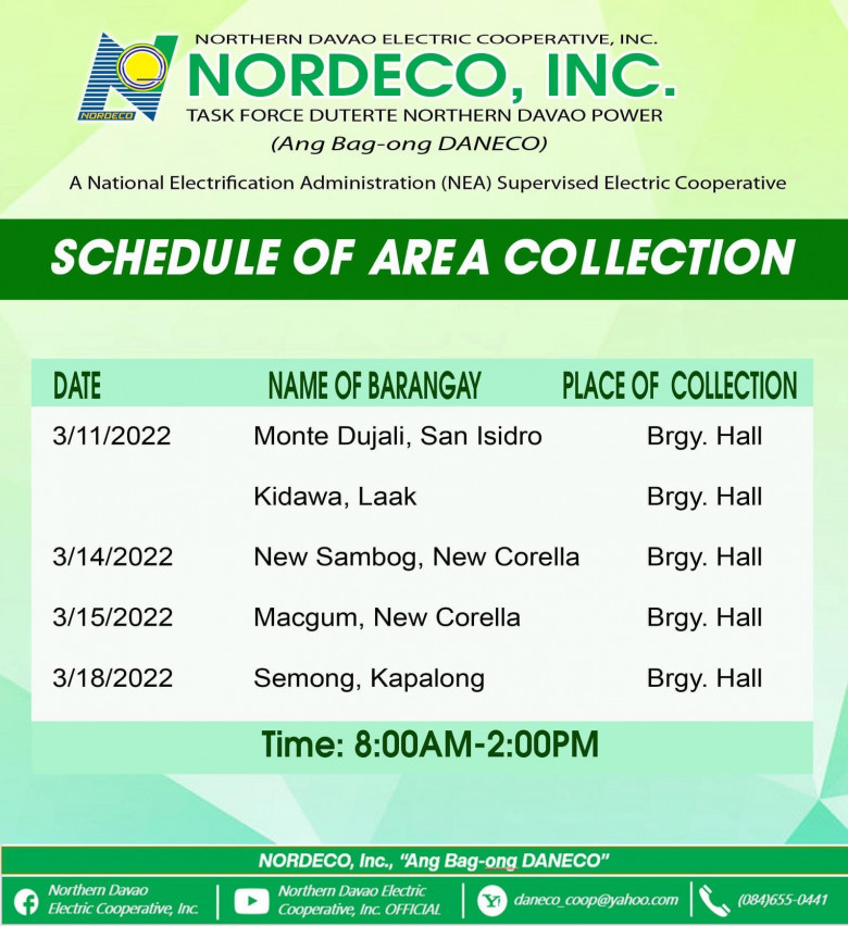 Simula ngayong araw (Marso 11) inilunsad ng Northern Davao Electric Cooperative (NORDECO) Inc., ang area collection activities nito para sa kaginhawaa ng kanilang mga member-consumer-owners (MCOs).