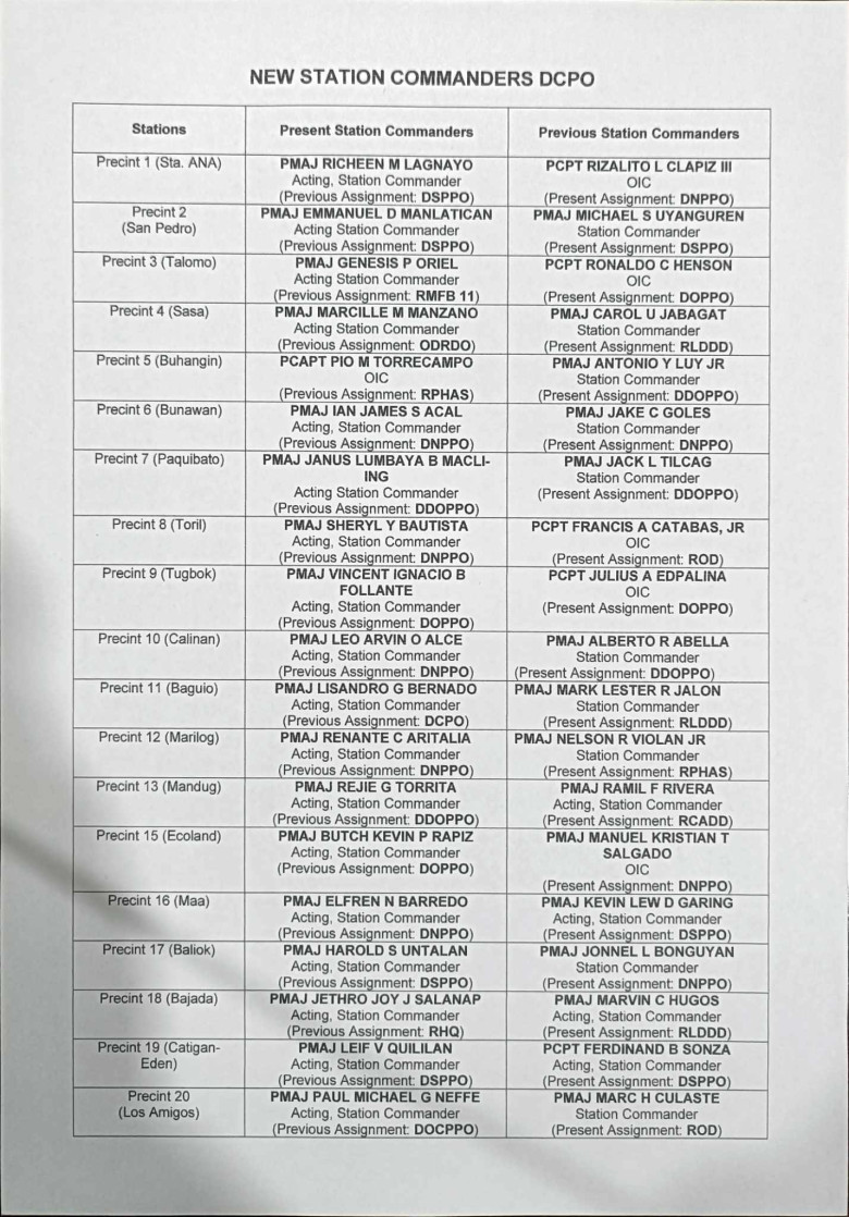 DAVAO CITY- Nineteen police officials here have been relieved from their respective posts as station commanders effective Monday, July 8.