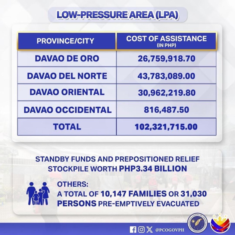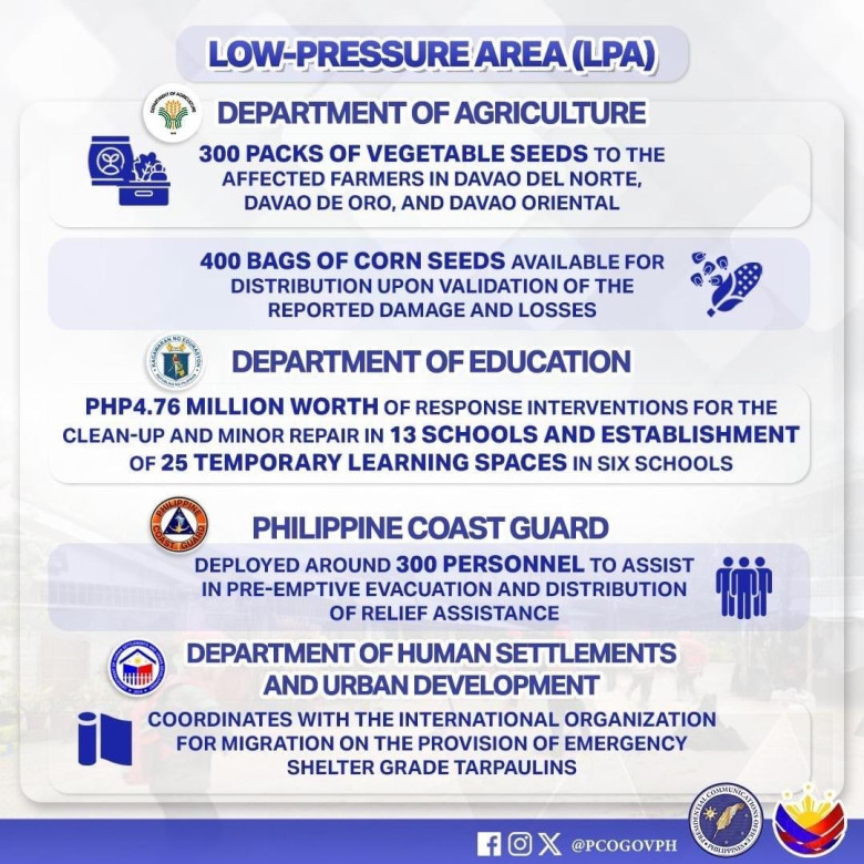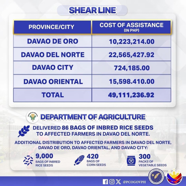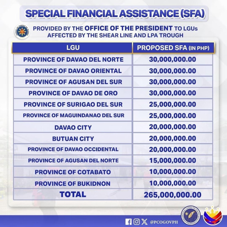 The provinces of Davao del Norte, Davao Oriental, Agusan del Sur, Davao de Oro received PhP30 million each while the provinces of Surigao del Sur and Maguindanao del Sur received PhP25 million each.