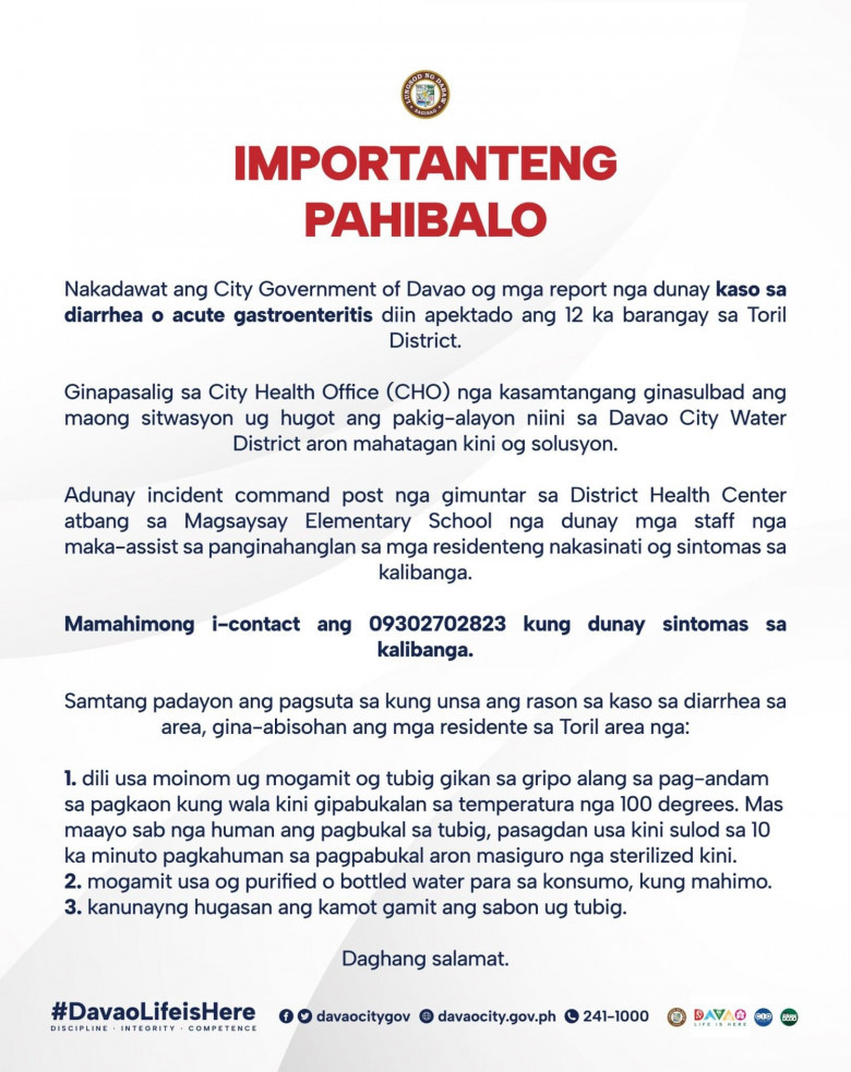 The residents of Toril District were advised to boil their water before consumption following the suspected water contamination in said area.