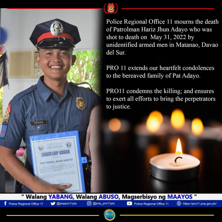 Police Regional Office (PRO) 11 in its report identified the victim as Patrolman Hariz Jhun Adayo, assigned at Don Marcelino MPS, Davao Occidental.
