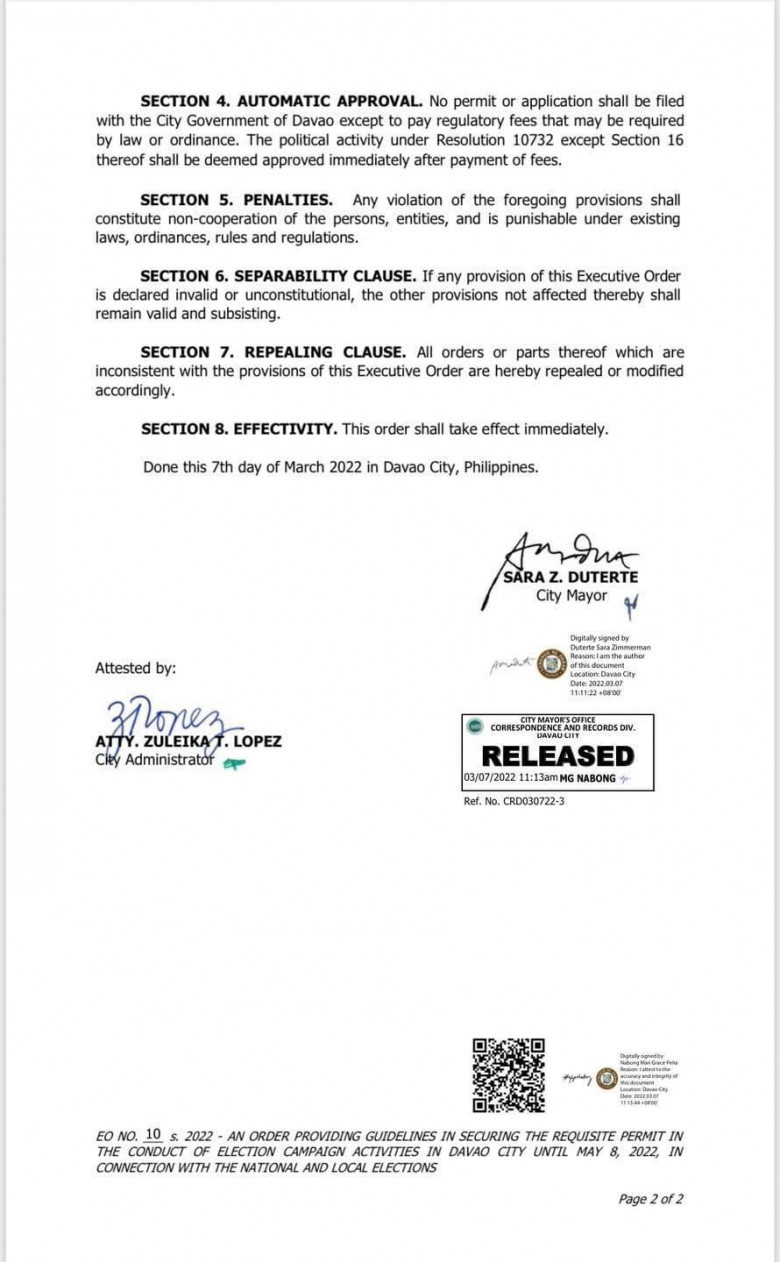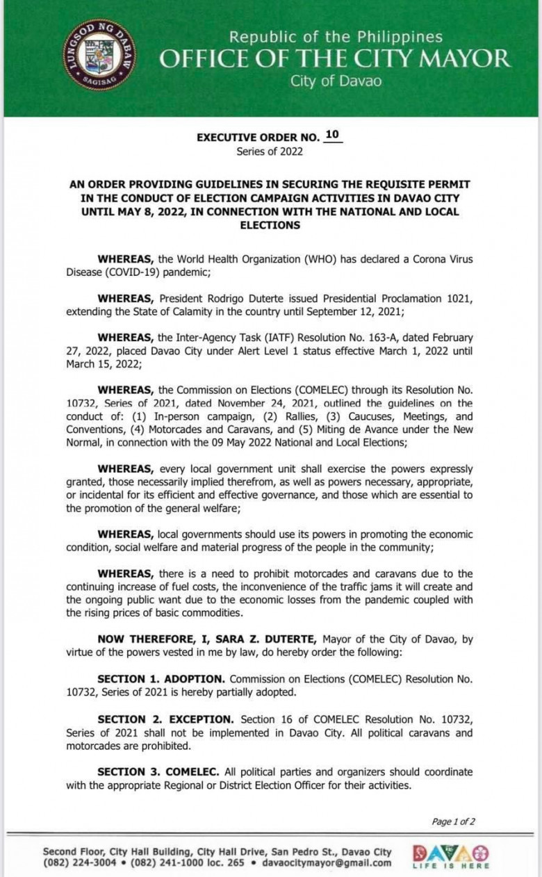 The order, providing guidelines in securing the required permit to conduct 2022 election campaign related activities in Davao City until May 8, was signed by Mayor Sara Duterte, Monday (March 7).