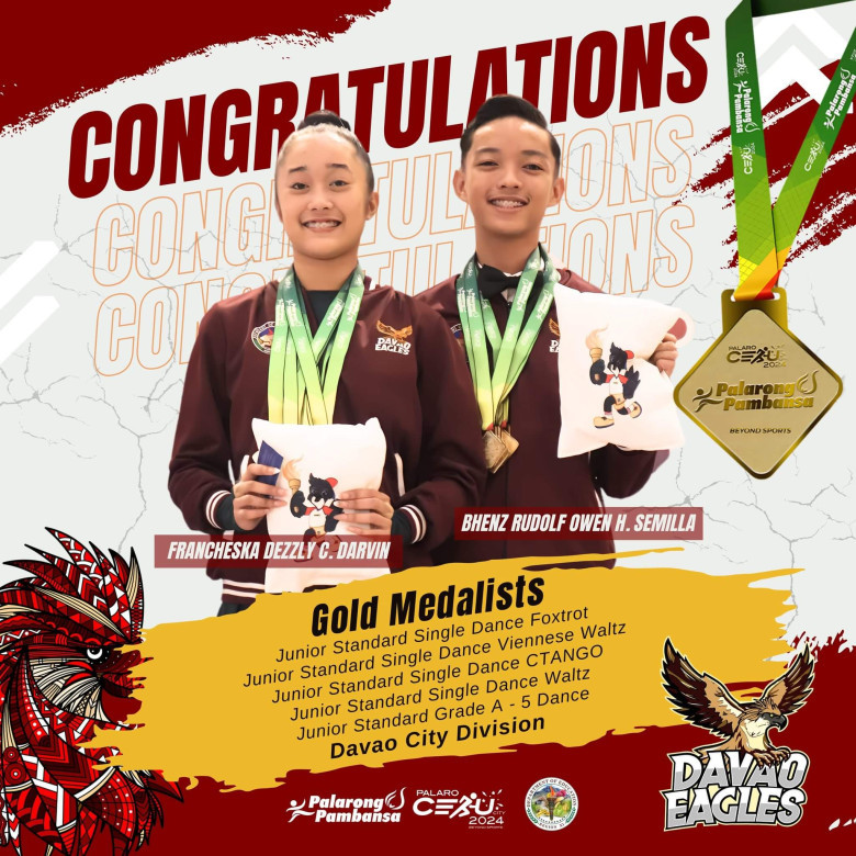 The outstanding performances by Francheska Dezzly C. Darvin and Bhenz Rudolf Owen H. Semilla, both from the world-class Tibungco Dancesport Team, have significantly boosted the medal tally for Region 11.