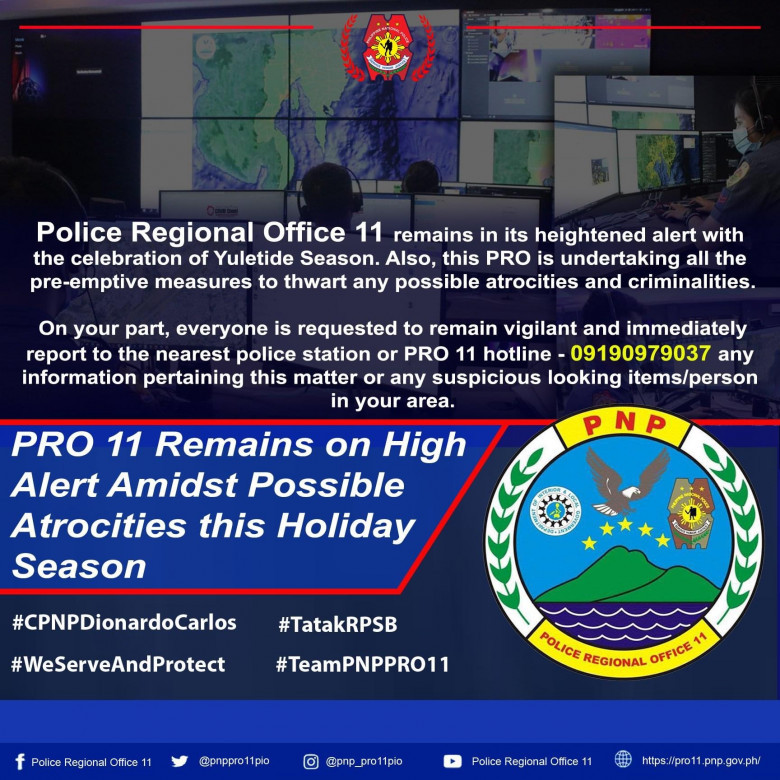 The advisory stated that “Violent extremism is a scourge around the globe and Dabawenyos should, at all times, remain vigilant. On the other hand, threats may be politically motivated, particularly from people who have evil intent.”
