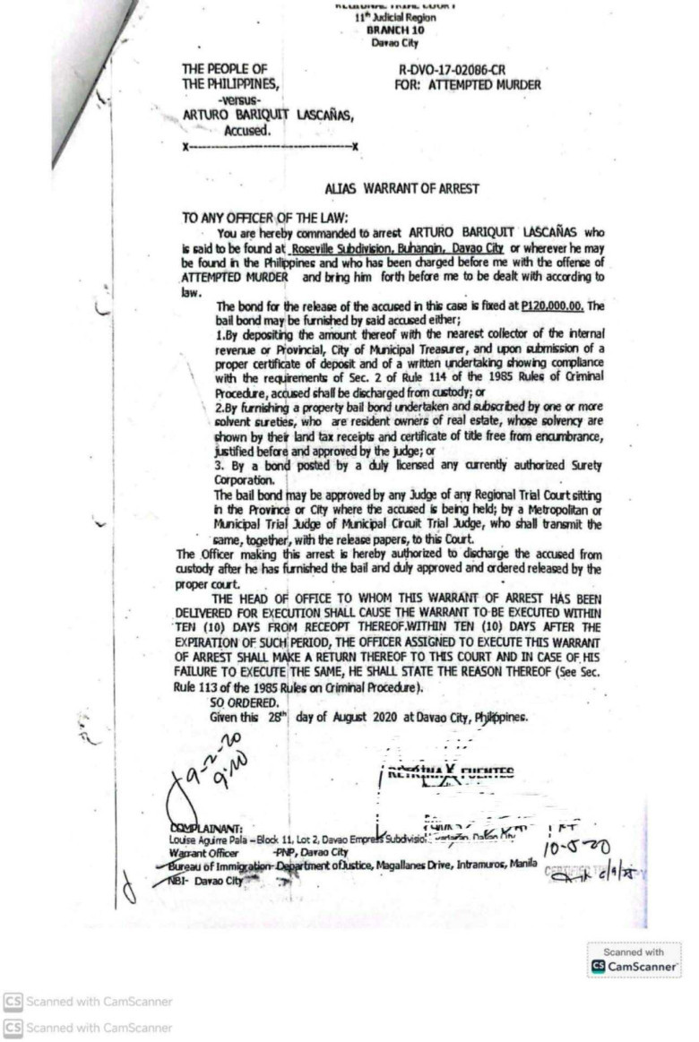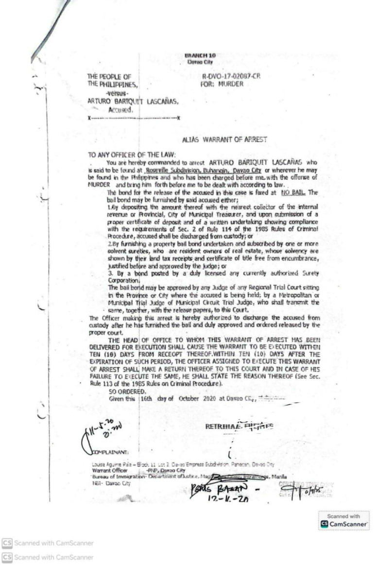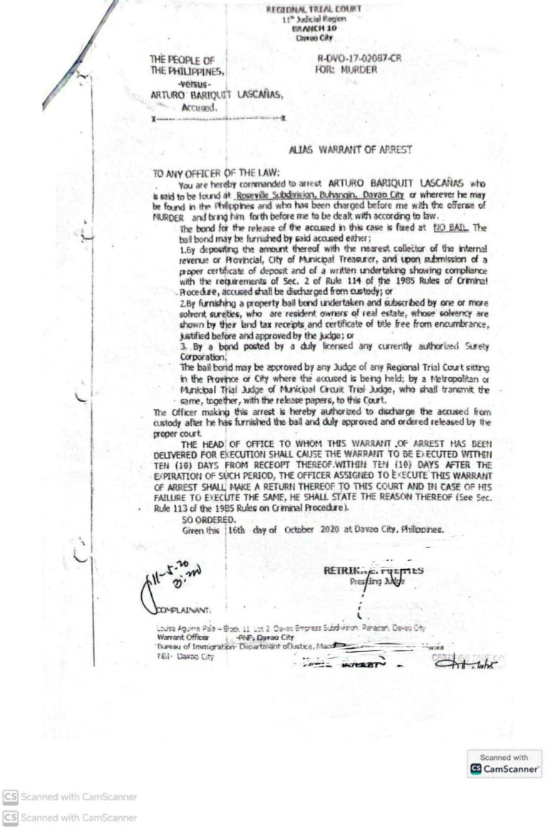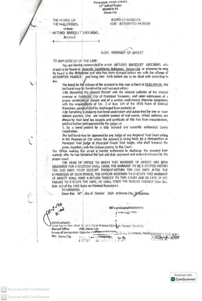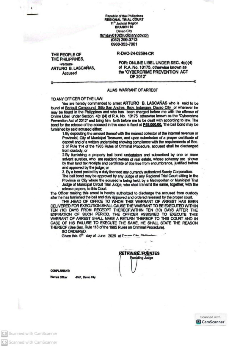 In the most recent case, docketed as R-DVO-24-02594-CR, the court ordered law enforcement to arrest Lascañas for online libel under Section 4(c)(4) of Republic Act No. 10175, or the Cybercrime Prevention Act of 2012.