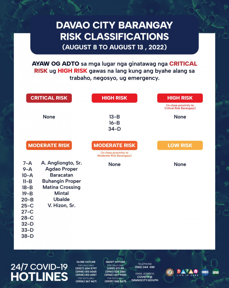High-risk barangays from August 8 to 13 are 13-B, 16-B, and 34-D.