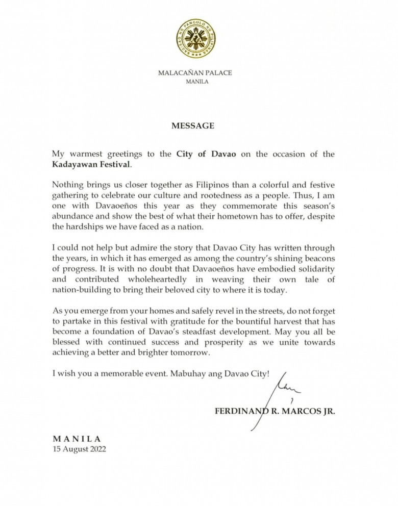 "Nothing brings us closer together as Filipinos than a colorful and festive gathering to celebrate our culture and rootedness as a people. Thus, I am one with Davaoeños this year as they commemorate this season's abundance and show the best of what their hometown has to offer, despite the hardships we have faced as a nation," Marcos said in his message.