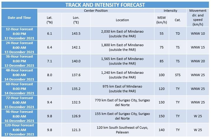 • On the forecast track, the tropical depression is forecast to move generally west northwestward over the next three days and may enter the Philippine Area of Responsibility (PAR) on Tuesday. Once inside the PAR, the domestic name “ODETTE” will be assigned to this tropical cyclone. By Wednesday evening or Thursday morning, the tropical cyclone will begin to move westward and may make landfall over Eastern Visayas-Caraga area.